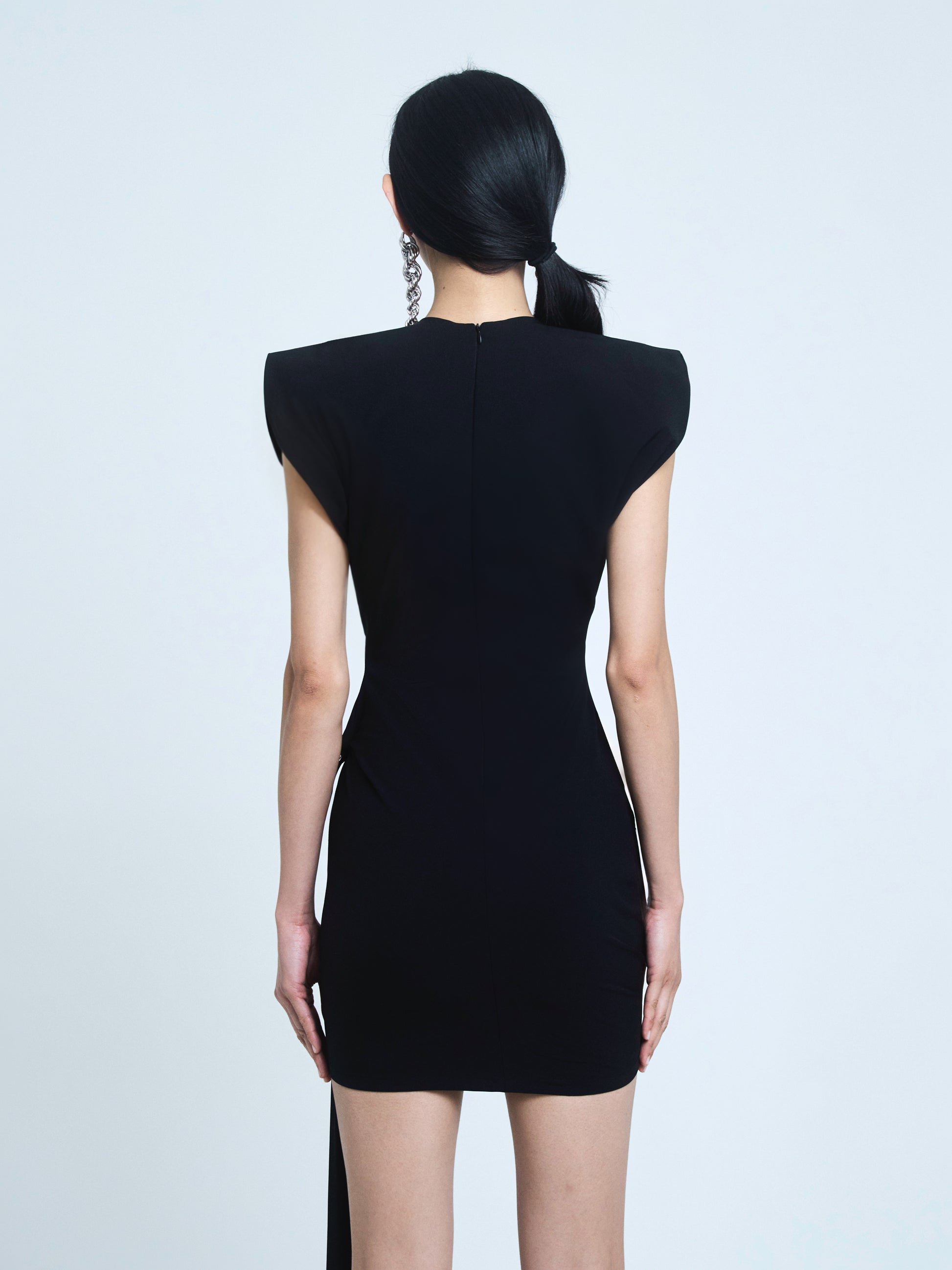 This black mini dress features padded shoulders, a waist accessory with a side-tied tail, and a back zipper. Made from stretch fabric for a sleek fit and bold look.