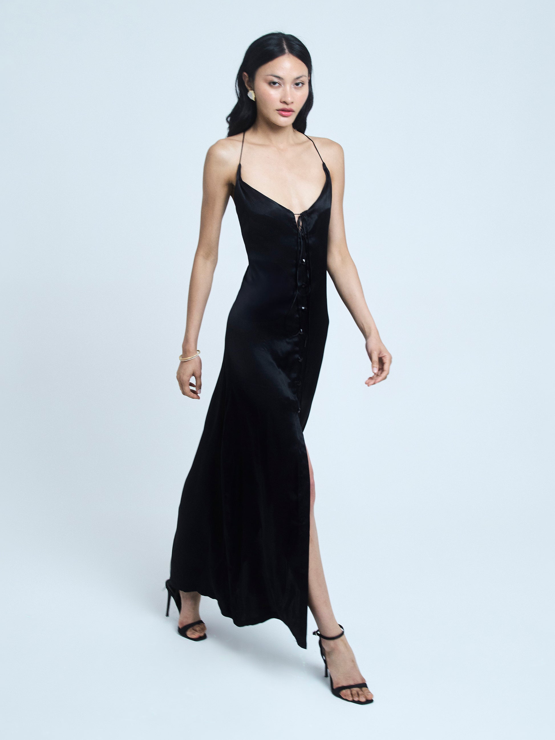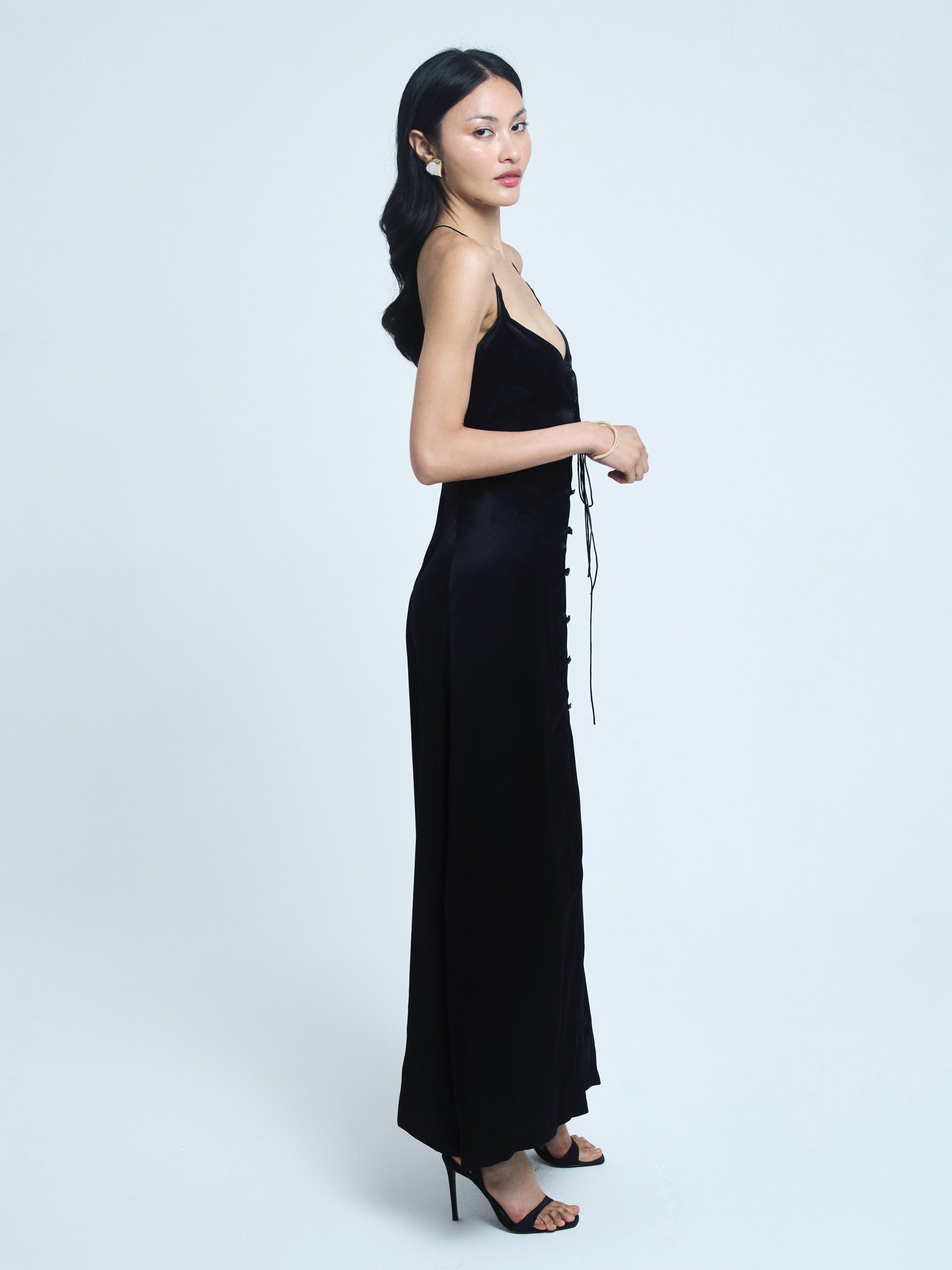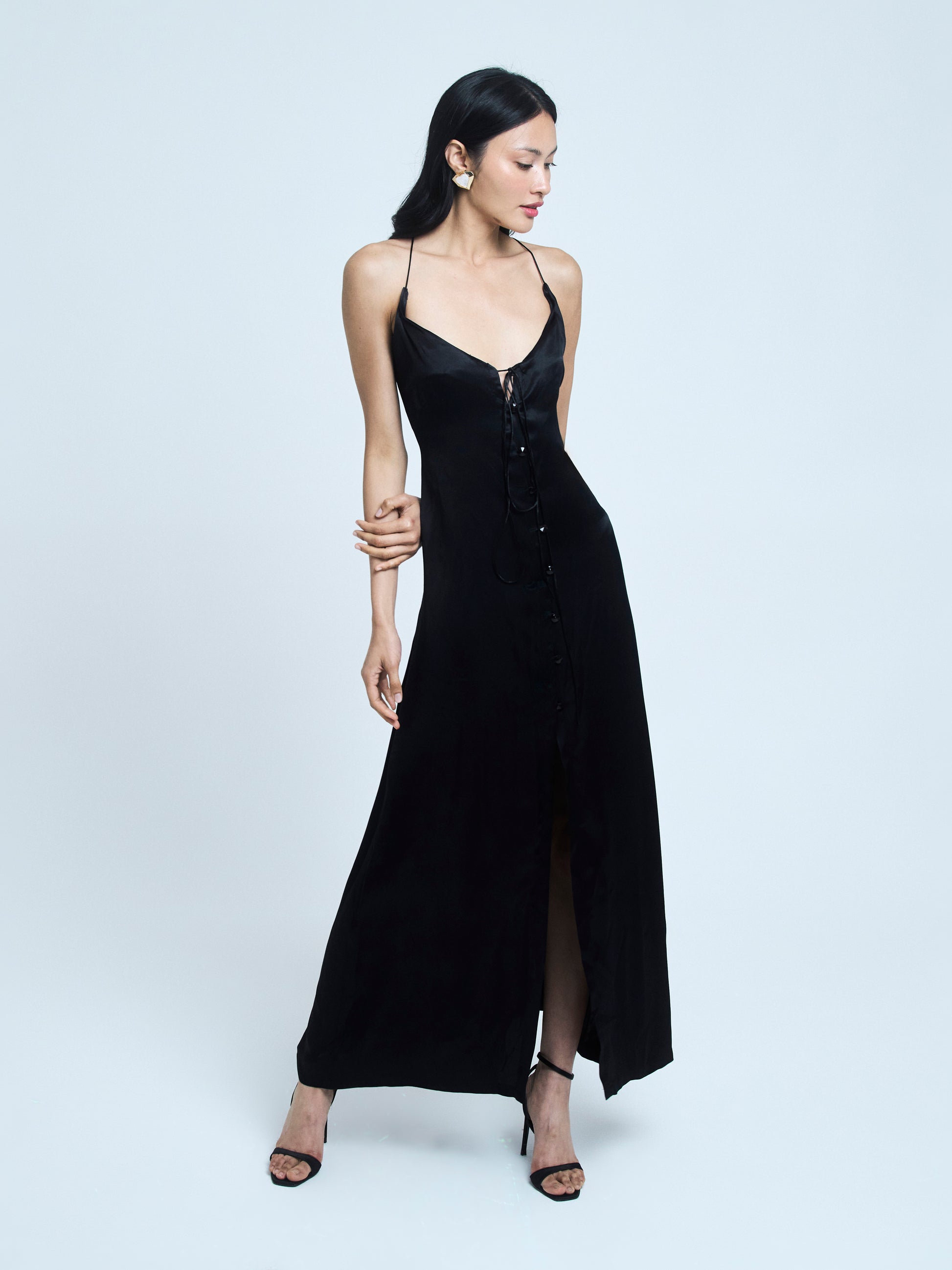 This versatile satin-touch floss viscose piece can be worn as a flowing cape-style top or buttoned up to transform into a chic dress. Featuring elegant button details and adjustable ties for a customizable fit that balances refinement with effortless style.