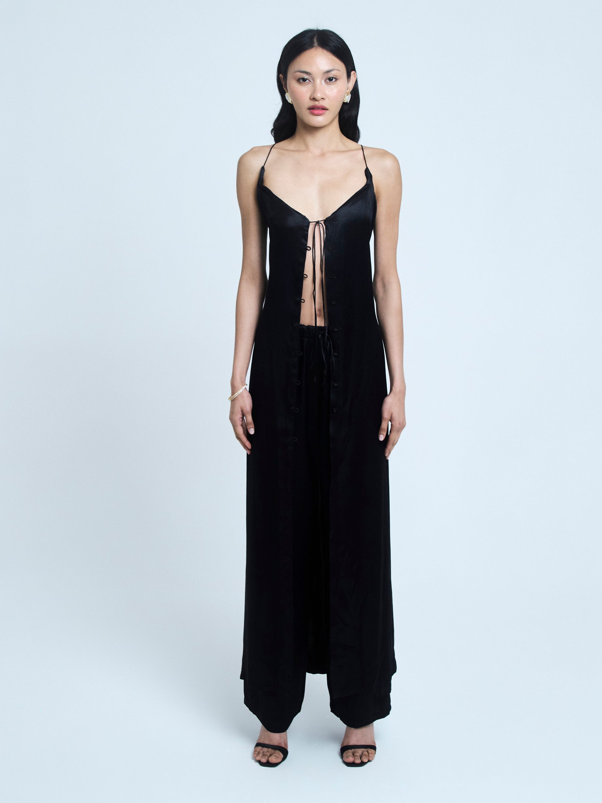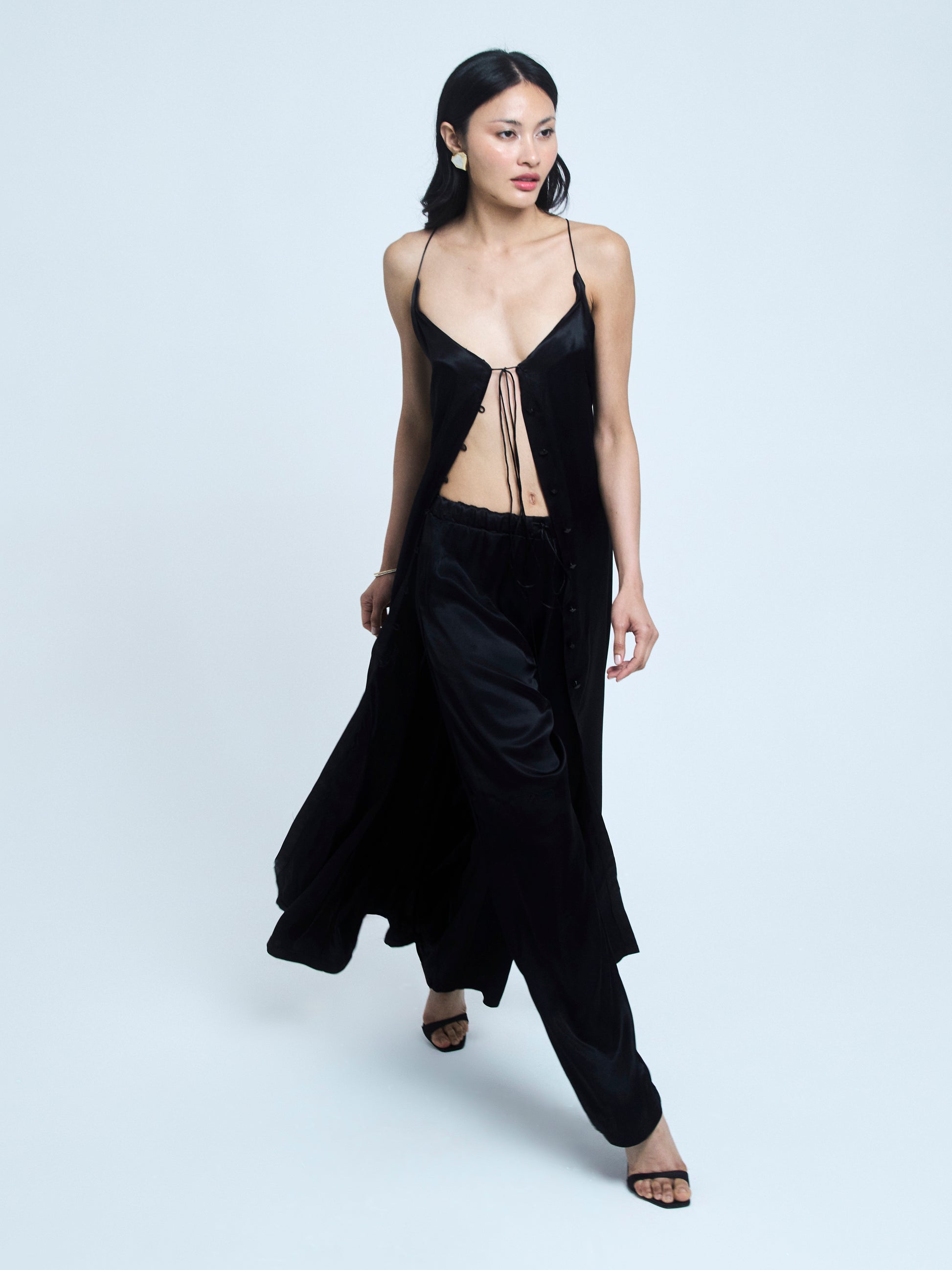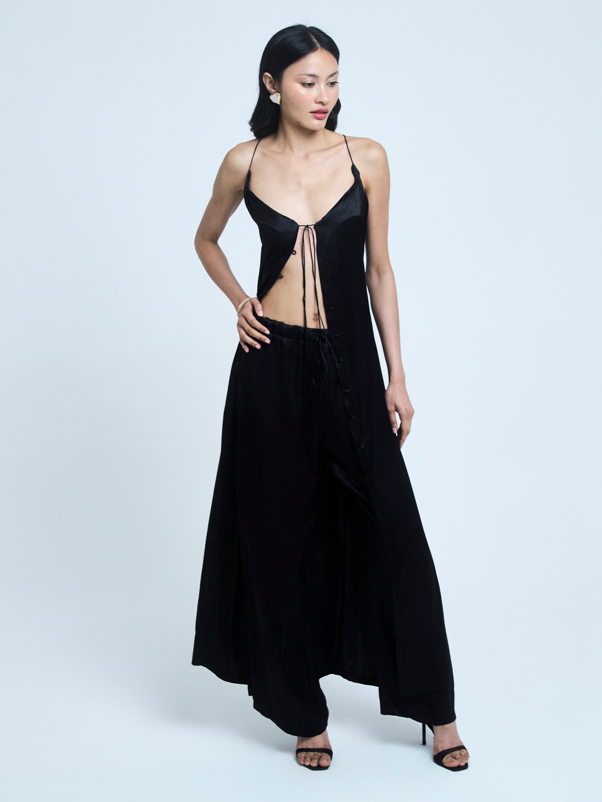 Crafted from satin-touch viscose fabric, this two-piece set offers a refined yet relaxed look. The top features button details and a cape-style long layer with adjustable ties. The pants come with an elasticated waistband and gold-accented drawstrings for a stylish and comfortable finish.