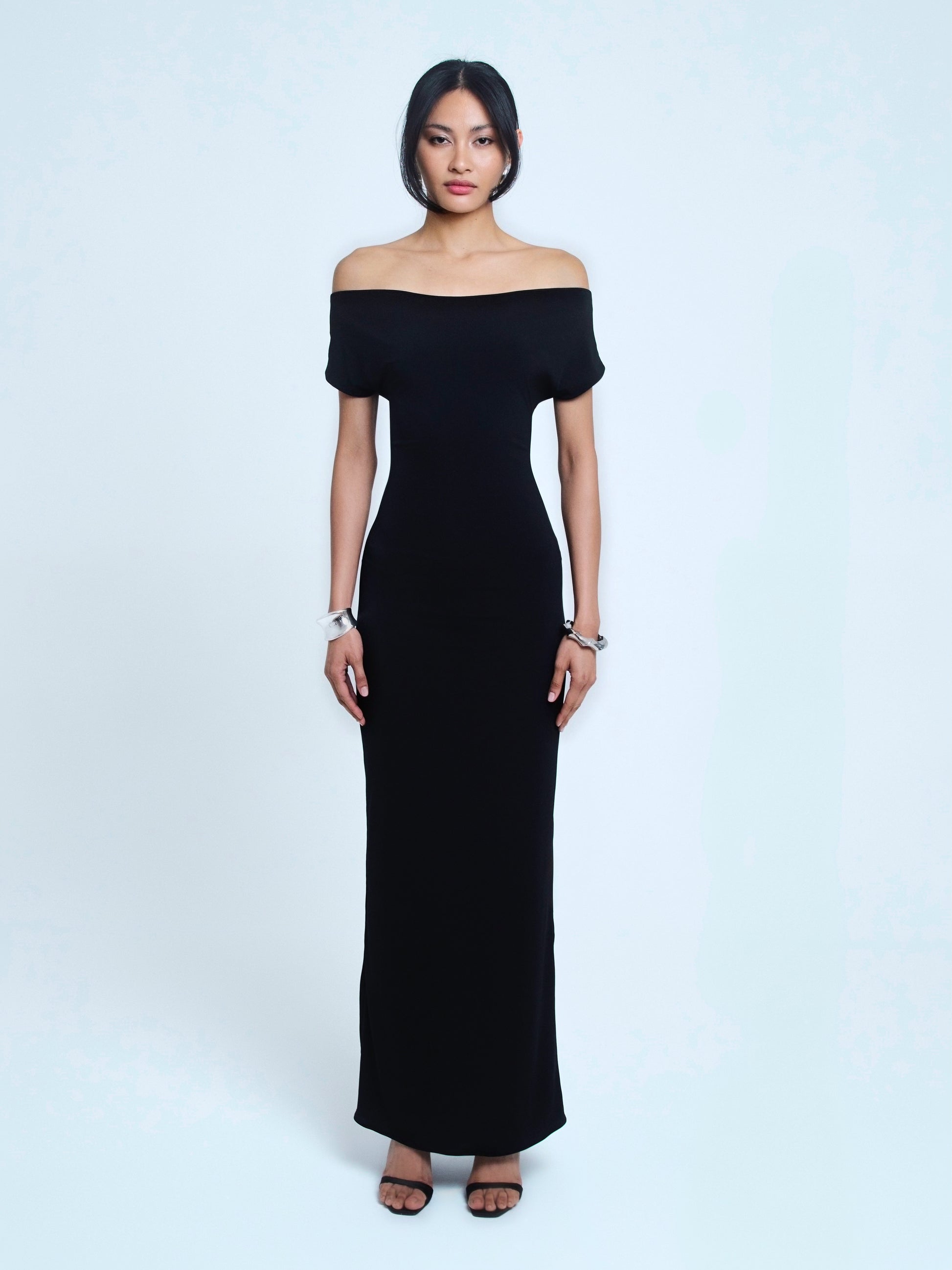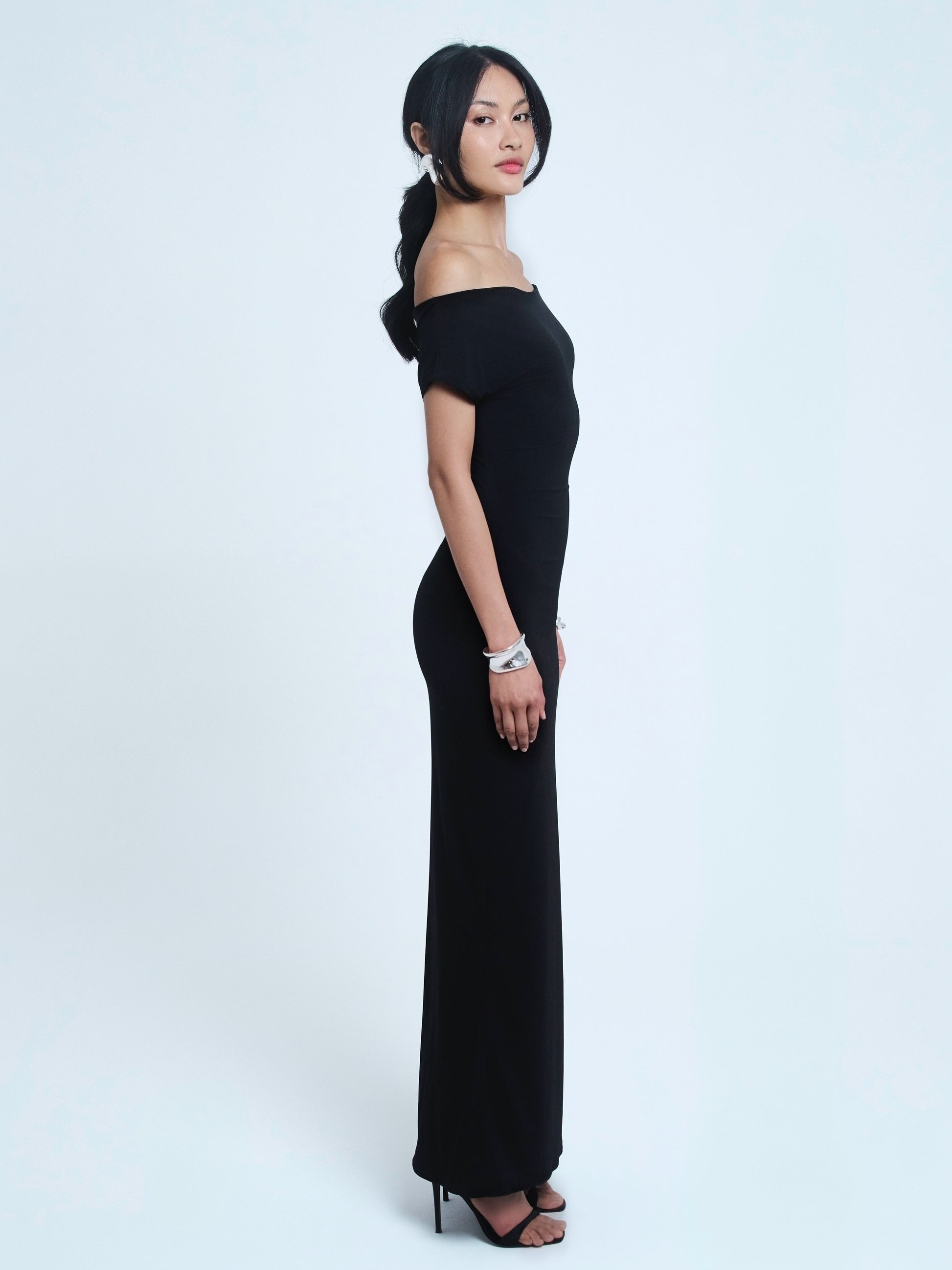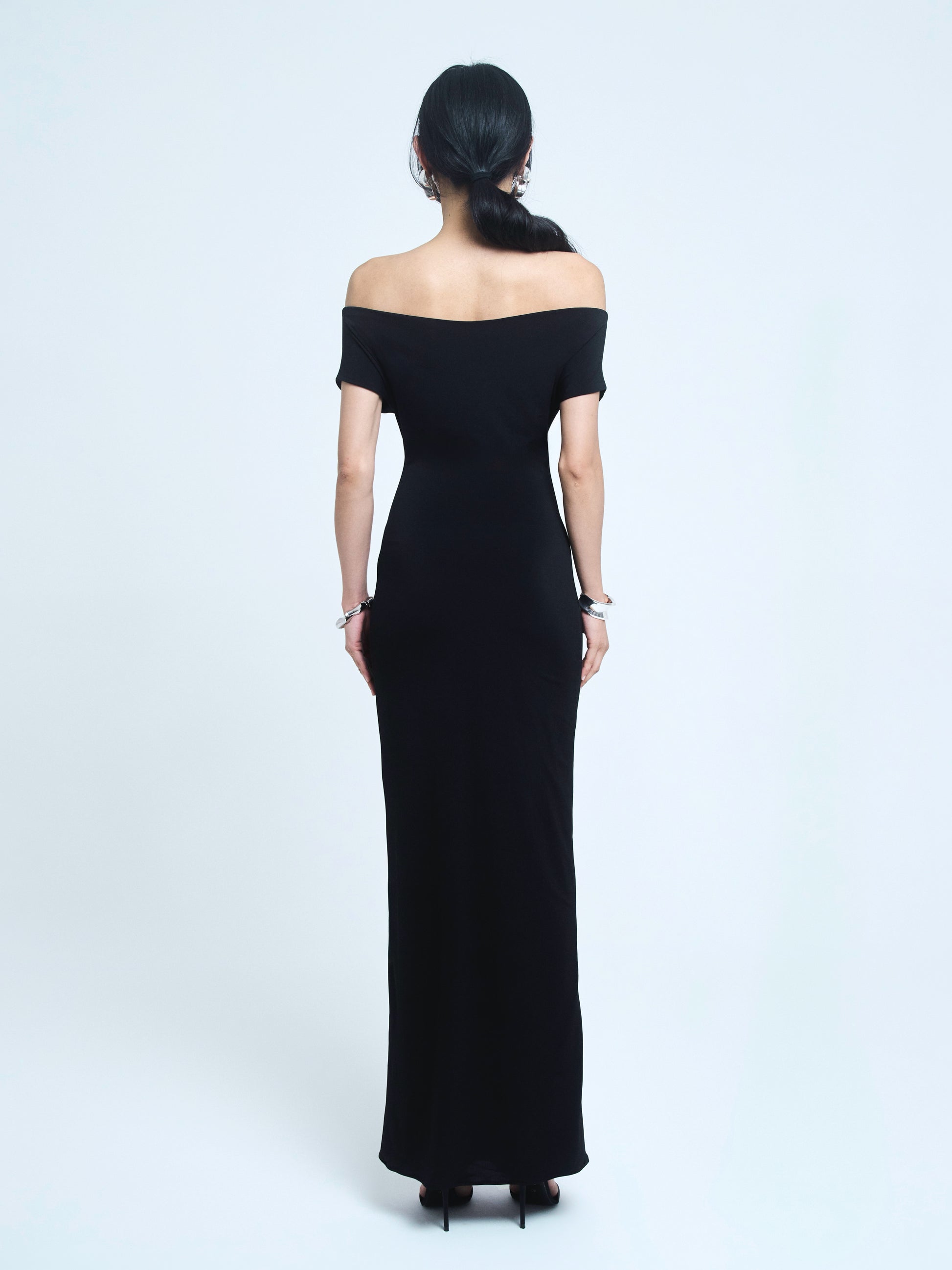 Effortlessly elegant. This black jersey dress features an off-the-shoulder neckline and a sleek, straight silhouette that flatters with ease. Crafted from soft, fluid fabric, it offers comfort and grace in equal measure.It’s a versatile piece that embodies understated sophistication.