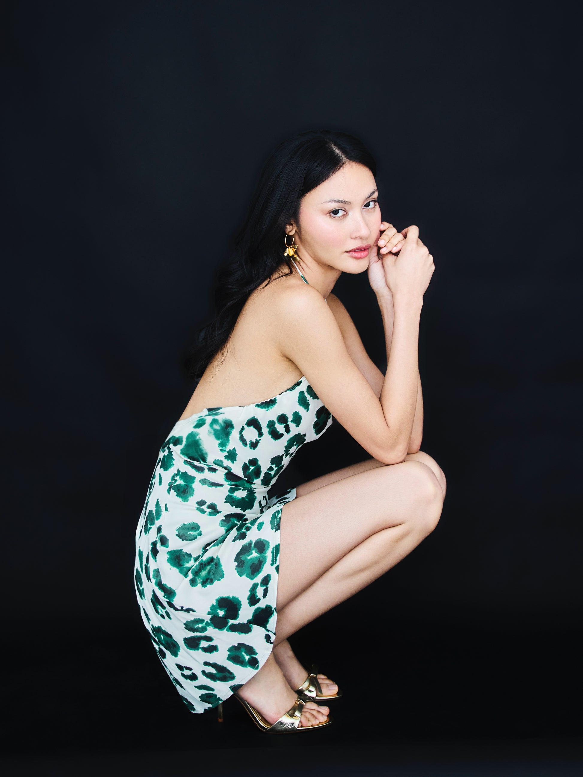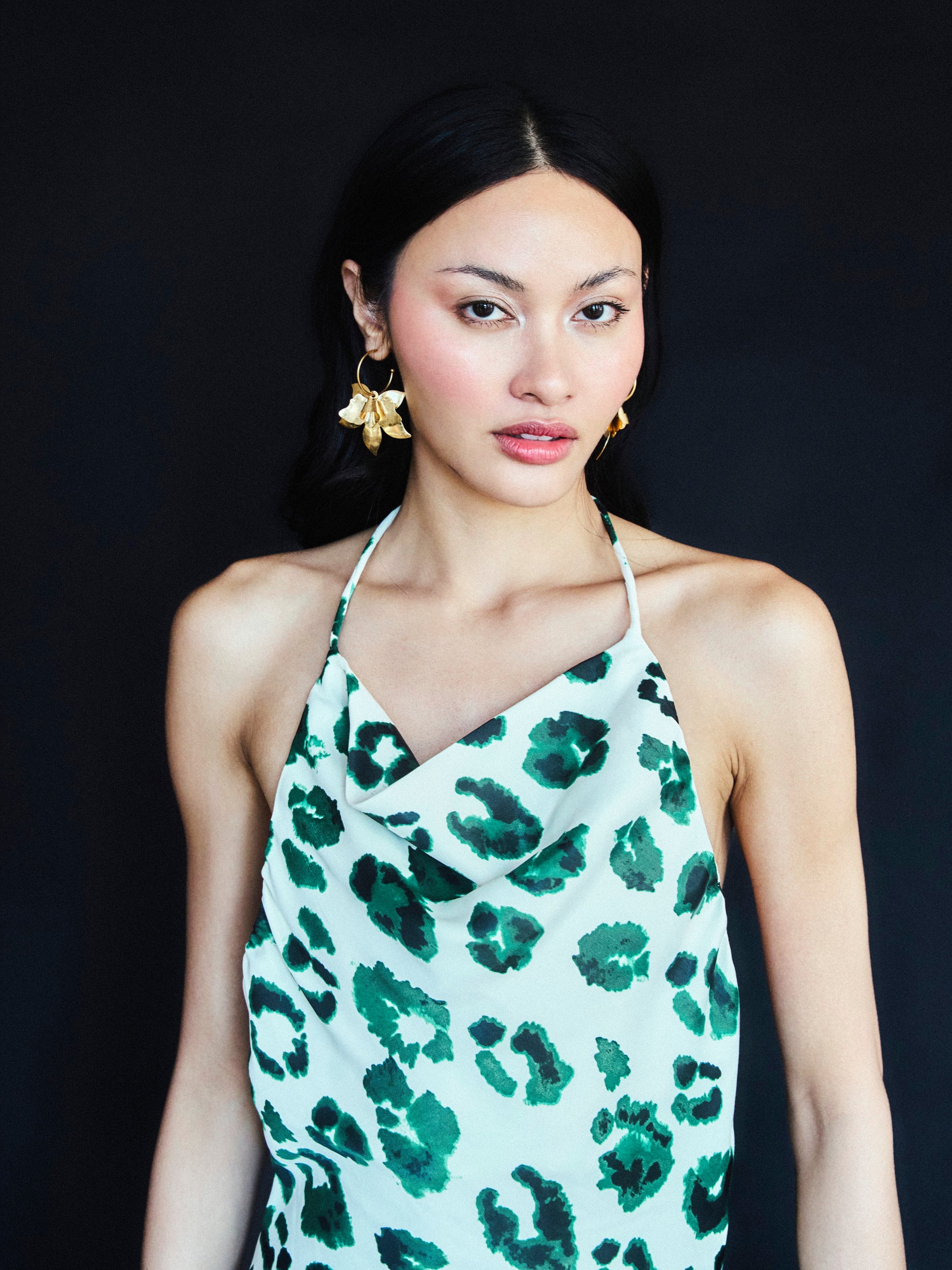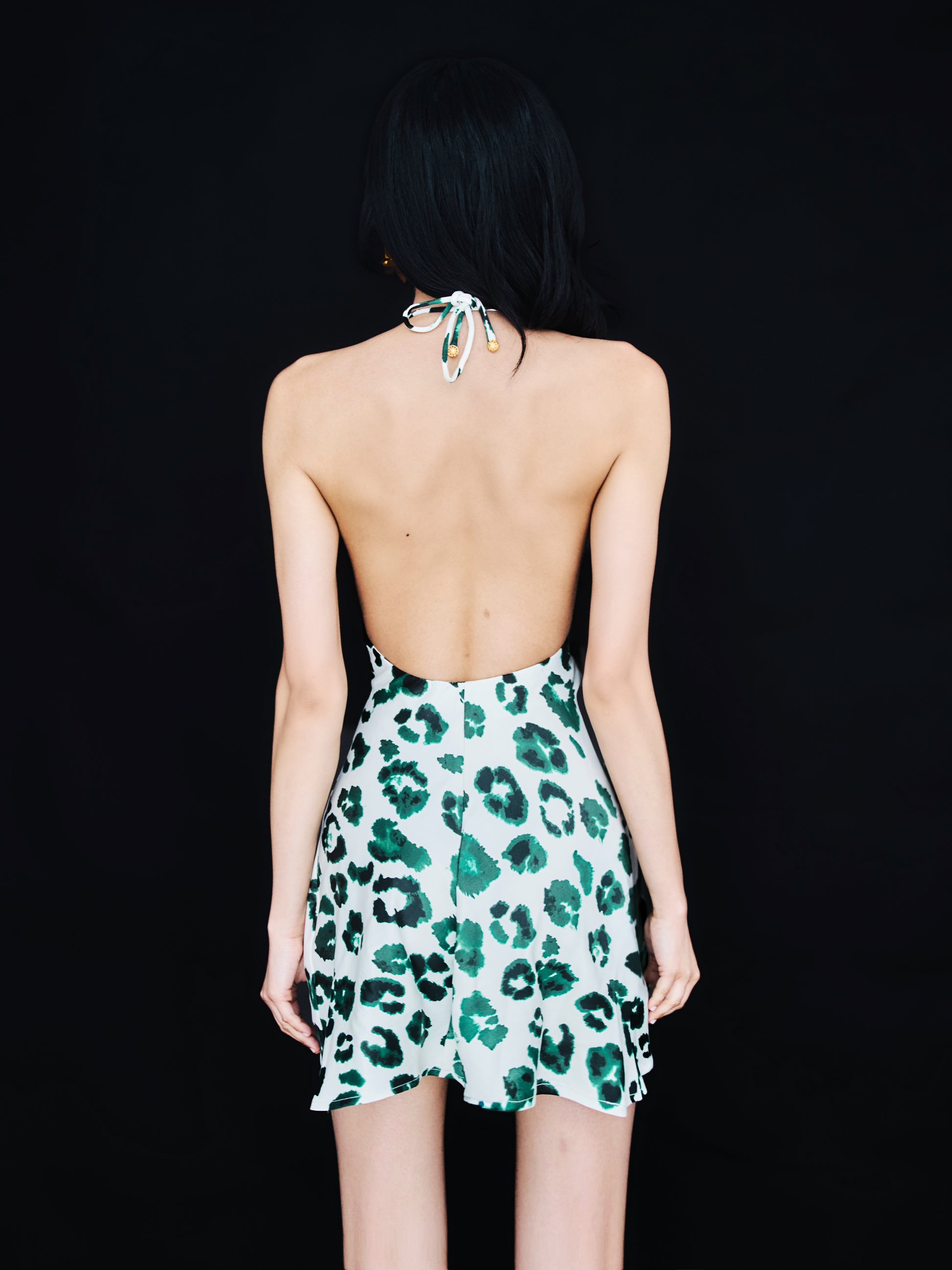 Short printed halter dress in floss viscose with tie details and gold accents. Light and stylish for warm days.